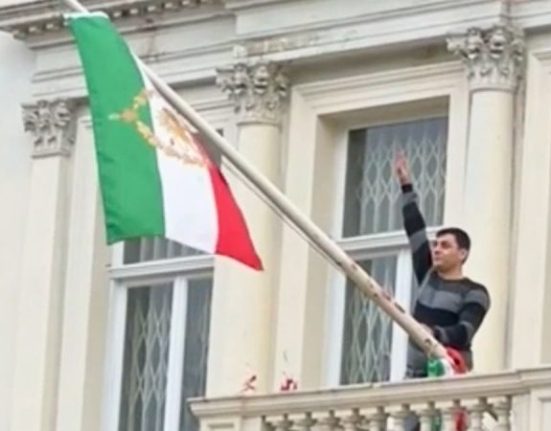An anti-regime protester scaled the balcony of Iran’s Embassy in London on Friday and tore down the Islamic Republic’s flag, replacing it with